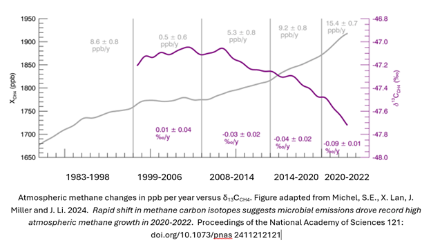 1 Michel, S.E., X. Lan, J. Miller and J. Li. 2024. Rapid shift in methane carbon isotopes suggests microbial emissions drove record high atmospheric methane growth in 2020-2022. Proceedings of the National Academy of Sciences 121: doi.org/10.1073/pnas 2411212121